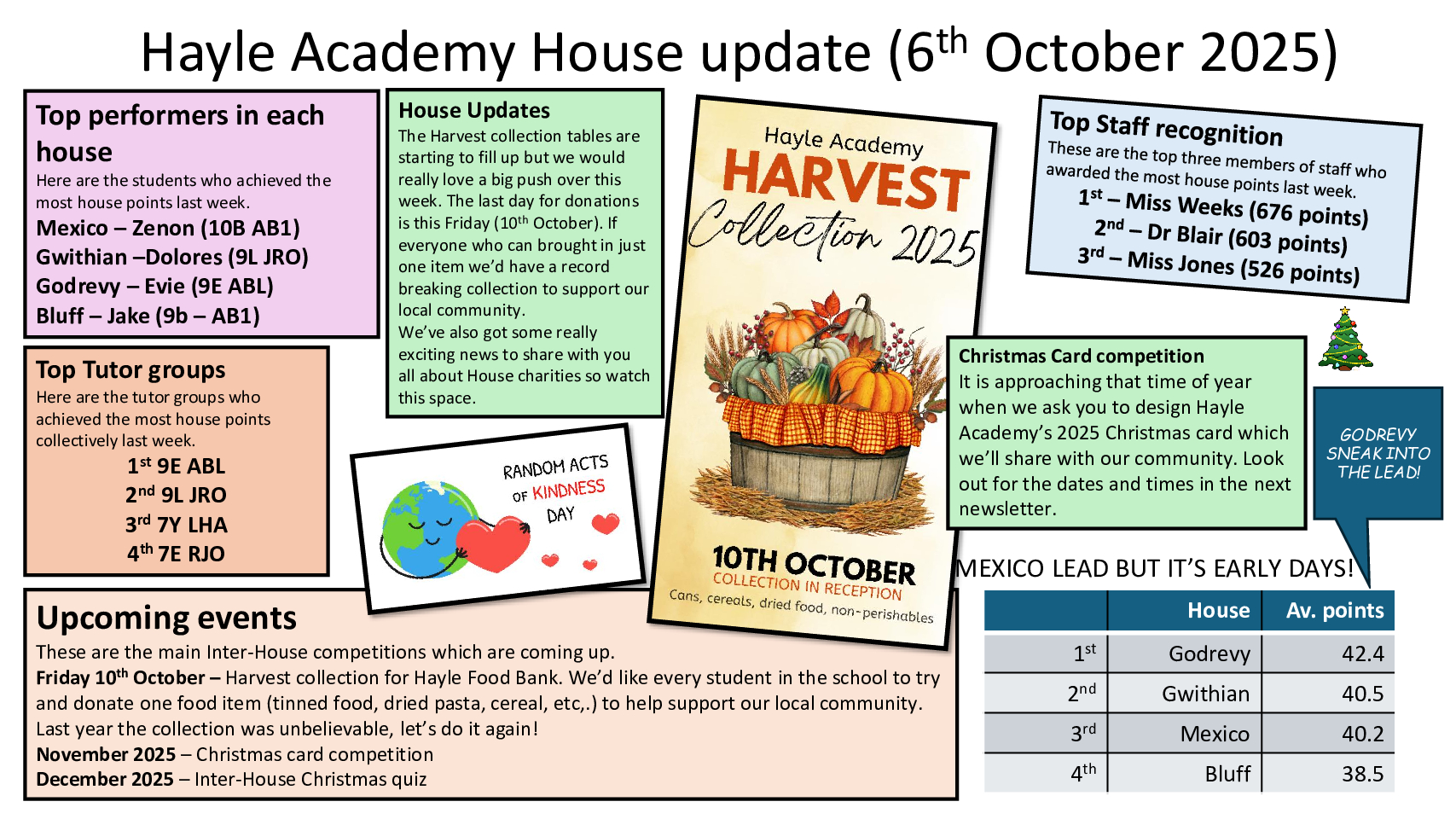 The four houses are named after four local coastal sites – Bluff, Godrevy, Gwithian and Mexico. House points are awarded to students for a multitude of positive actions from within the classroom to representing Hayle Academy in sports fixtures or academic challenges. Each year the prestigious House Cup is awarded to the house that has accumulated the most house points per student over the whole academic year.