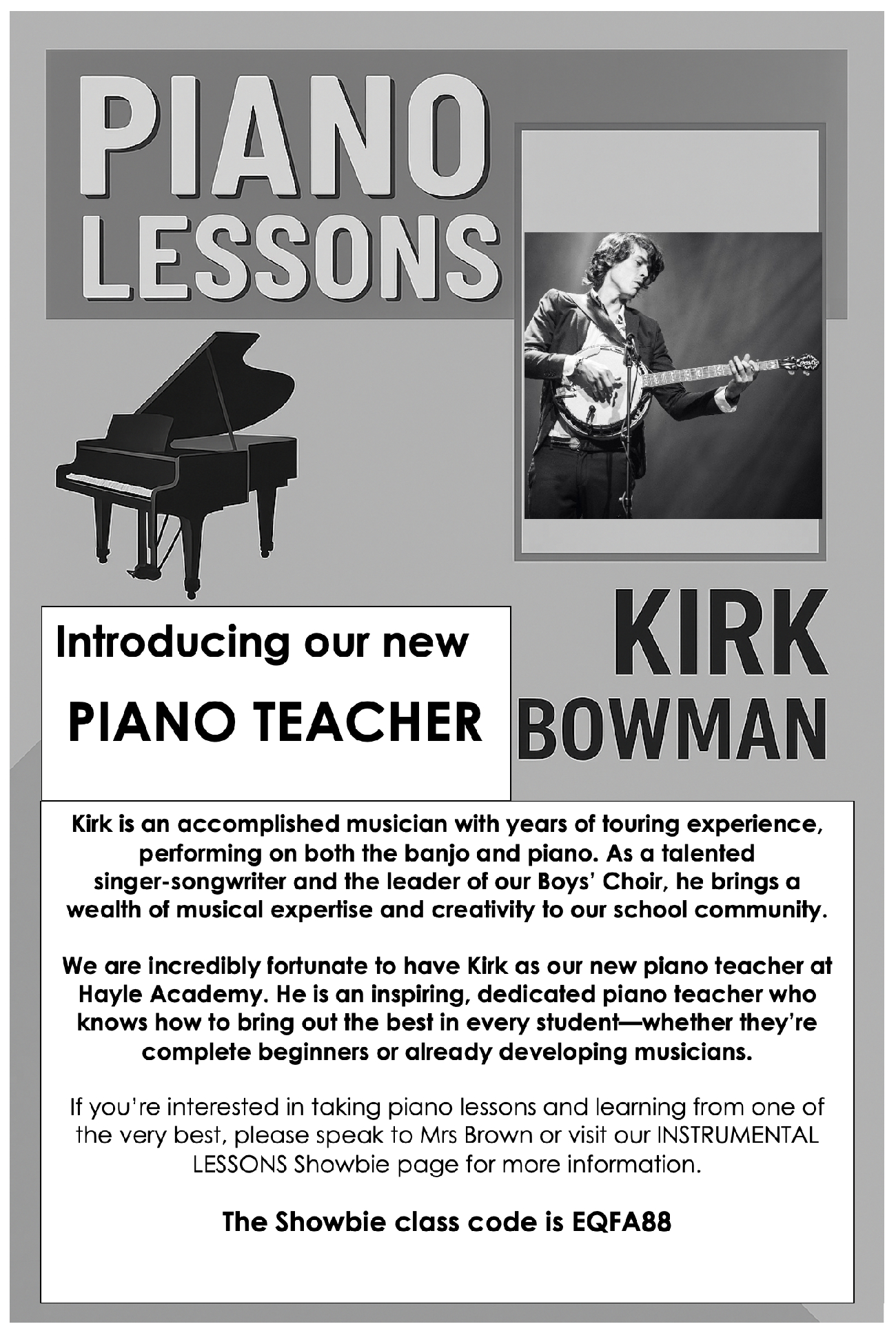 Piano: Kirk Bowman – to book lessons, please email kirk-009@hotmail.co.uk